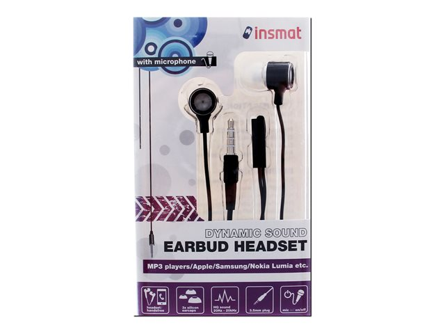 Produktbeskrivelse Insmat - headset Produkttype Headset - kabling Farve Sort Hovedtelefonmodeller I øret Forbindelsesteknologi Kabling Lydudgangsmodus Stereo Mikrofon Med kabel Driftsmåde af mikrofon Mono -