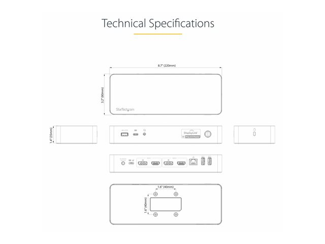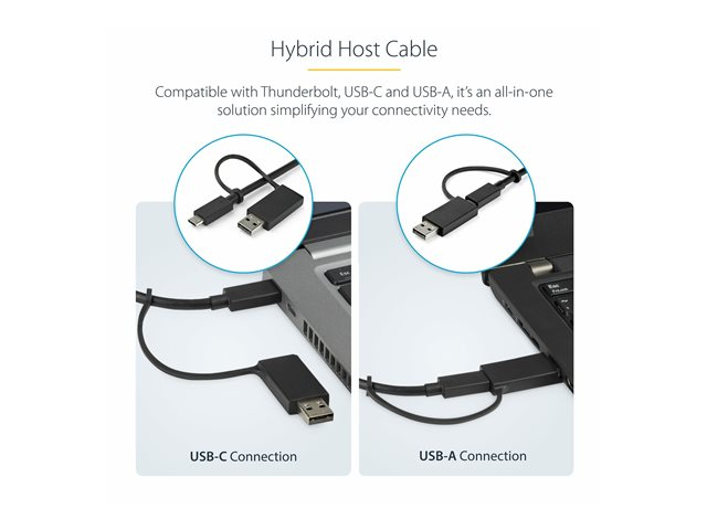 For fast setup right out of the box, the combo cable (USB-C with attached USB-A adapter) lets you connect any laptop. The dock has mounting holes for workstation mounting (bracket not included).