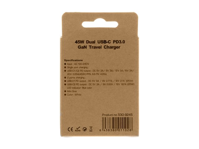 45 Watt - 3 A - PD/PPS - 2 output-stikforbindelser (24 pin USB-C)